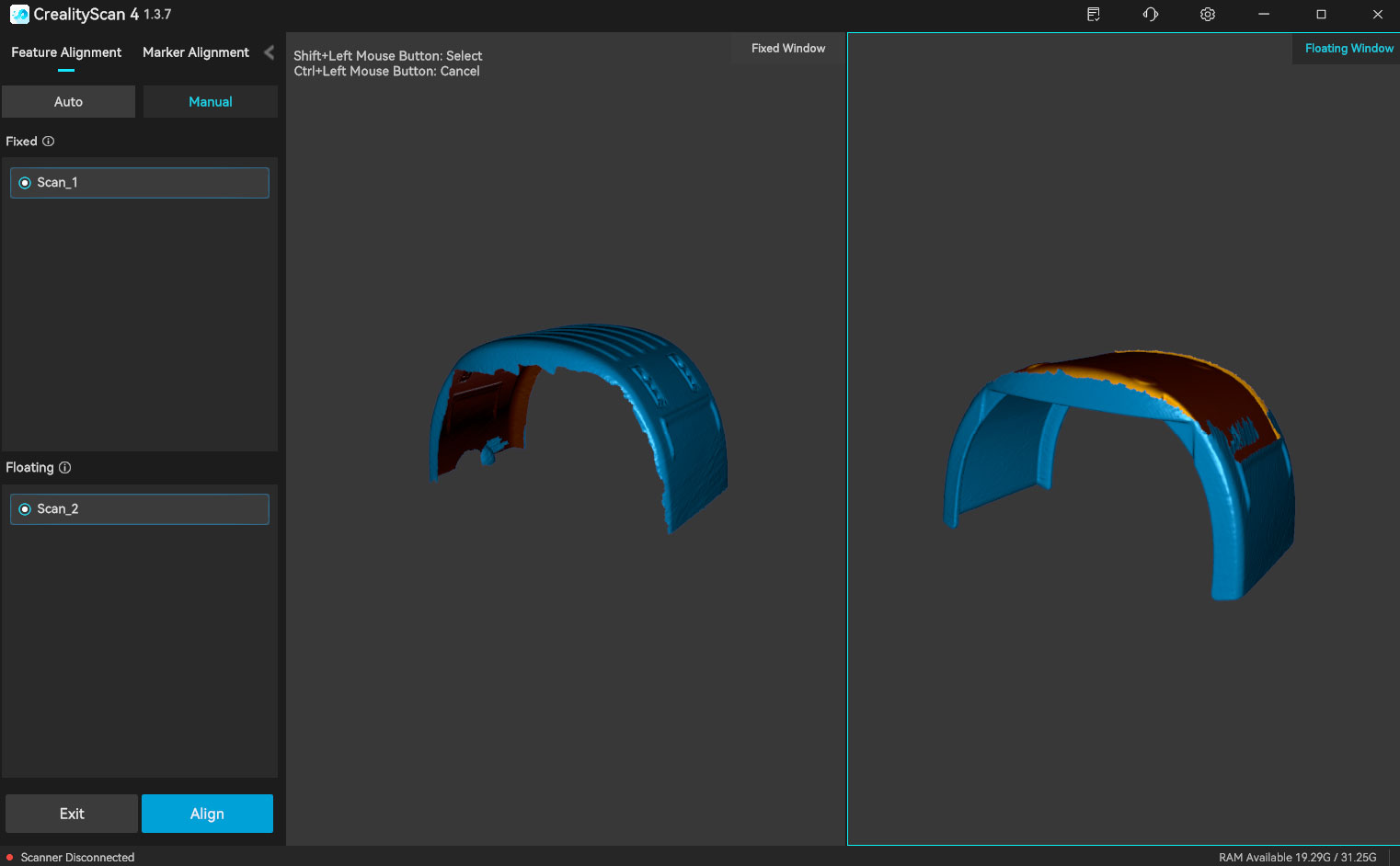 The next stage is to 'fuse' the point cloud into data that can be further processed by the software. Mostly, this is a one-click process and when completed, the 'meshing' process can be done. If two or more scans have been made, these have to be 'aligned' or merged together. Again, very often the complex algorithms in the software are clever enough to do this automatically, and combine the two scans into one object. A manual method is available, where three or more points on each scan are selected, then the software computes the alignment (merge).